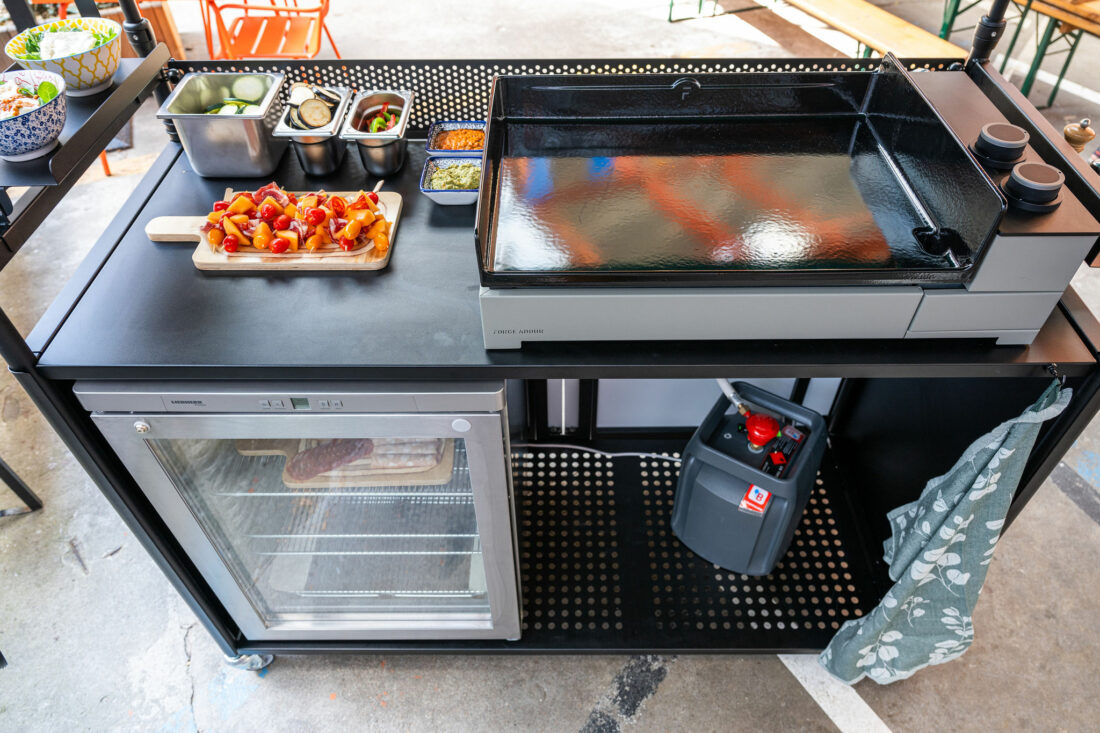 • Sur le plan de travail : en fonction de l’animation que vous réalisez et des produits présentés à la vente, vous pouvez agrémenter votre stand pliable de planchas, grills, crêpières, gaufriers, toasters, machines à hot-dogs, etc. Vous avez également la possibilité d’y placer des vitrines réfrigérées, percolateurs ou tireuses à bière.